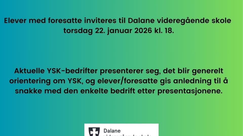 Invitasjon til YSK-informasjonsmøte Elever med foresatte inviteres til YSK-informasjonsmøte på Dalane videregående skole, 22 januar 2026 kl. 18.