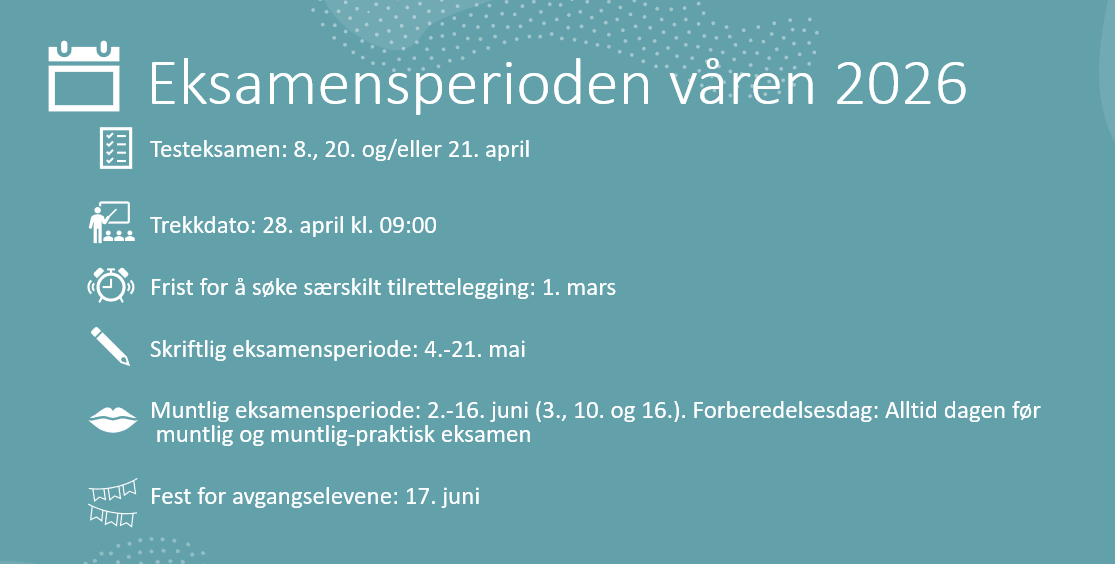 Informasjon om eksamensperioden våren 2026 - viktige datoerInformasjon om eksamensperioden våren 2026 - til elever ved Dalane vgs. Publisert 09.04.2026 08.55 Sist endret 09.04.2026 09.22