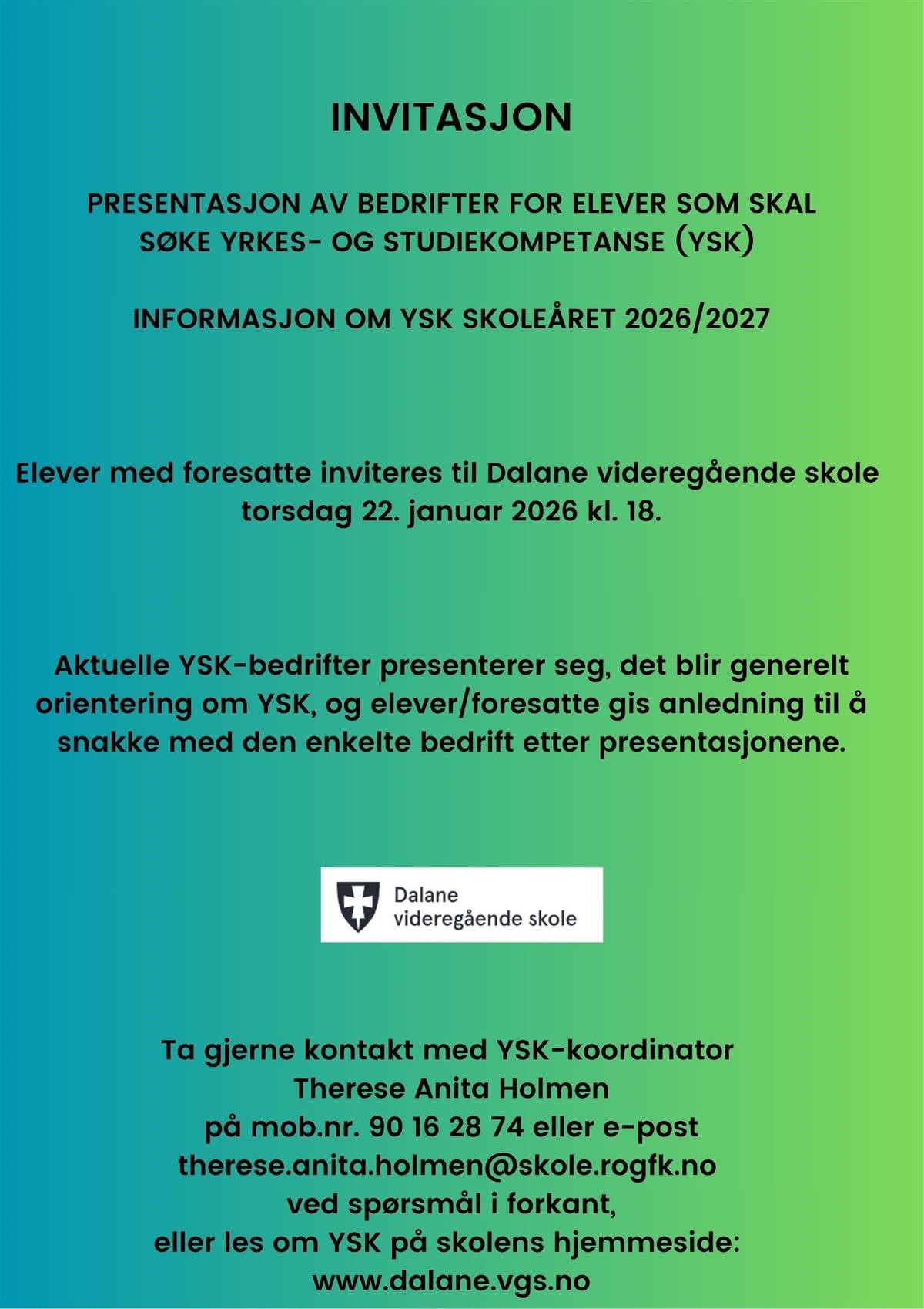 Invitasjon til YSK-informasjonsmøteElever med foresatte inviteres til YSK-informasjonsmøte på Dalane videregående skole, 22 januar 2026 kl. 18. Publisert 16.10.2025 10.38 Sist endret 16.10.2025 10.40