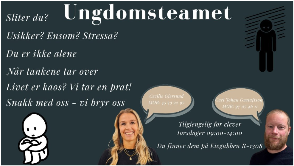 De er tilgjengelige for deg som trenger og ønsker hjelp og støtte, og er til stede på Dalane videregående skole torsdager hver uke mellom 9-14.